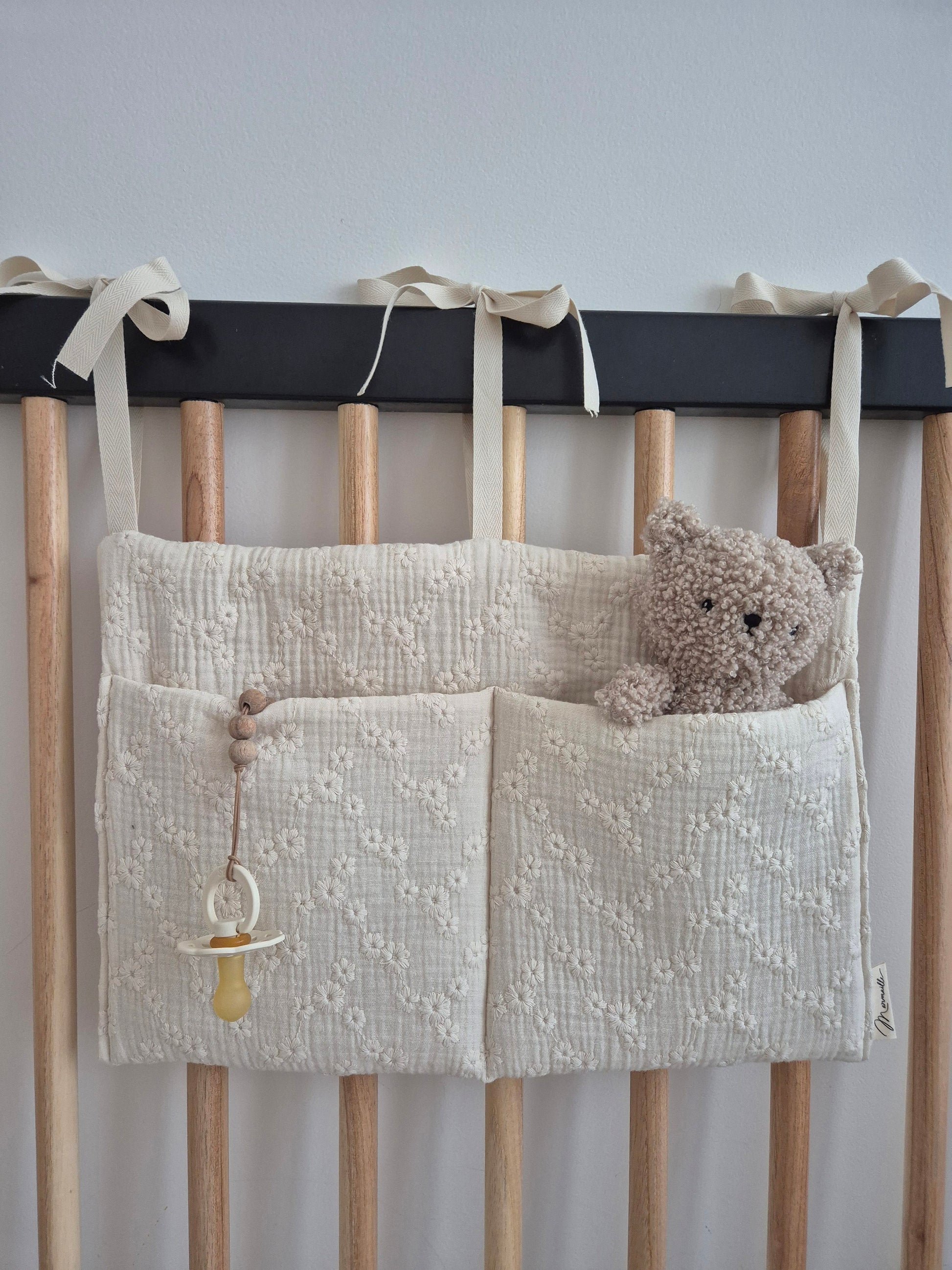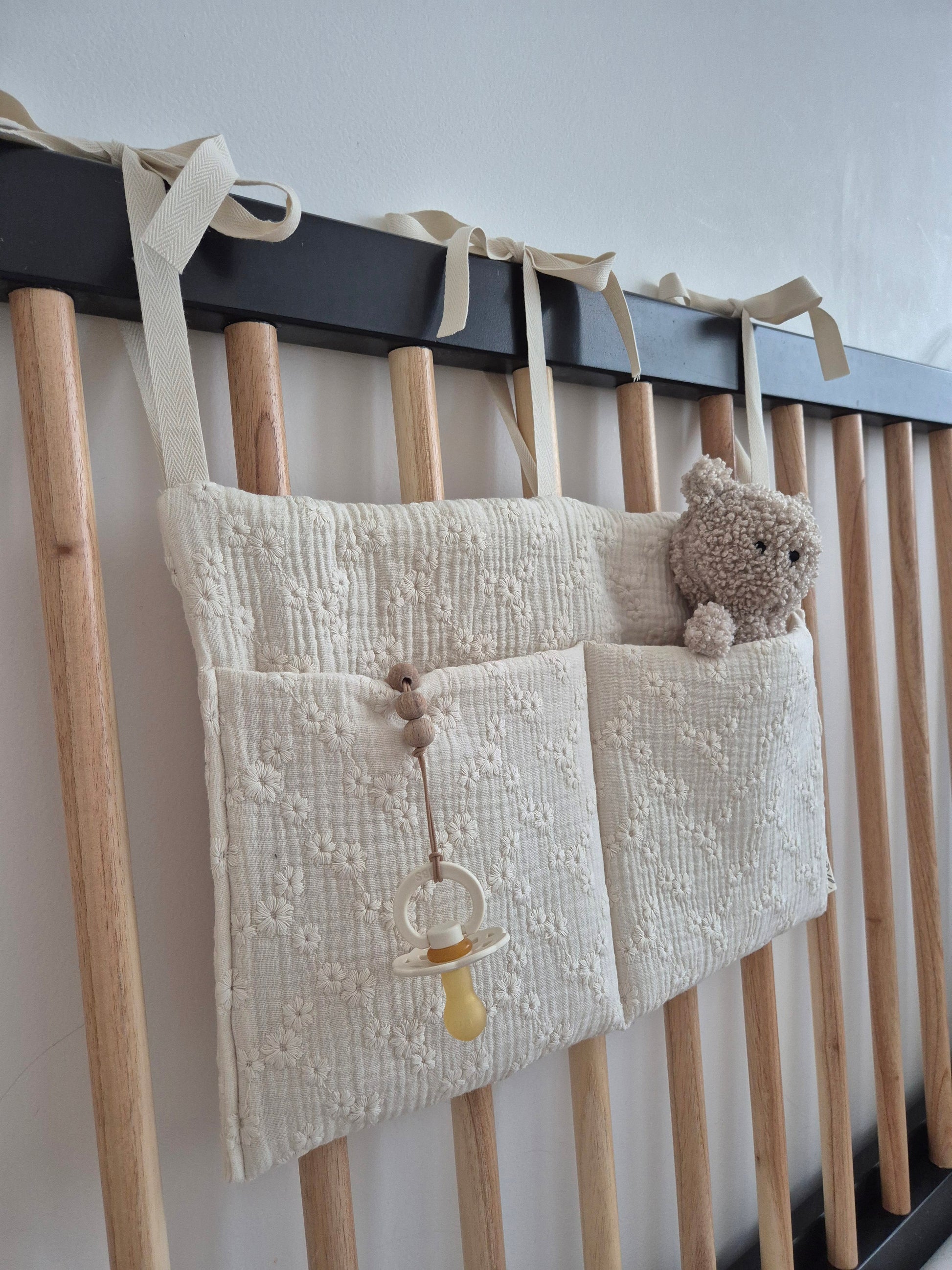 Avec sa capacité à s'adapter à tous les lits à barreaux grâce à ses cordons à nouer, il est idéal pour garder la chambre de bébé rangée et organisée, tout en lui ajoutant une touche décorative.